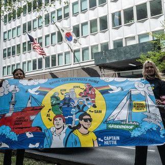 2025년 5월 16일, 국제환경단체 그린피스는 서울중앙지방법원 앞에서 기자회견을 열어 생산 감축을 포함한 강력한 국제 플라스틱 협약의 필요성을 주장했다. 이번 기자회견은 지난해 11월 충남 서산 대산석유화학단지 인근 해상에서 평화 시위를 벌인 그린피스 인터내셔널 액티비스트 4인과 그린피스 레인보우 워리어호 헤티 기넨 선장의 재판 직후 진행됐다. 한국정부는 ‘폭력행위 등 처벌에 관한 법률 위반’ 혐의로 이들 활동가들은 재판에 넘기고 출국을 정지시켰다. 출국 정지된 활동가는 네덜란드 출신의 레인보우 워리어호 선장 헤티 기넨(Hettie Geenen), 영국, 멕시코, 독일, 대만 출신의 활동가 샘(Sam), 알(Al), 옌스(Jens), 애쉬(Ash)다. 그린피스는 공식 성명을 통해 “민주주의 국가 한국에서 지구와 사람을 지키기 위한 정당한 행동을 했다고 믿으며, 수사에 성실히 임하고 있다. 하루빨리 가족과 친구들의 품으로 돌아갈 수 있도록 재판의 조속한 결정을 바란다”고 촉구했다