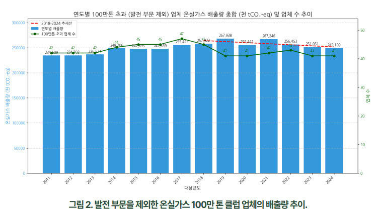 이를 고려해 발전·에너지 부문을 제외하더라도 배출 책임은 여전히 크다. 발전 부문을 제외한 100만톤 클럽 업체는 41곳이고, 이들의 배출량은 2억4910만톤이었다. 이는 우리나라 전체 배출량의 36%에 해당한다. 철강, 반도체, 시멘트, 정유, 석유화학 등 산업 부문이 핵심 배출원으로 남아 있는 것이다.